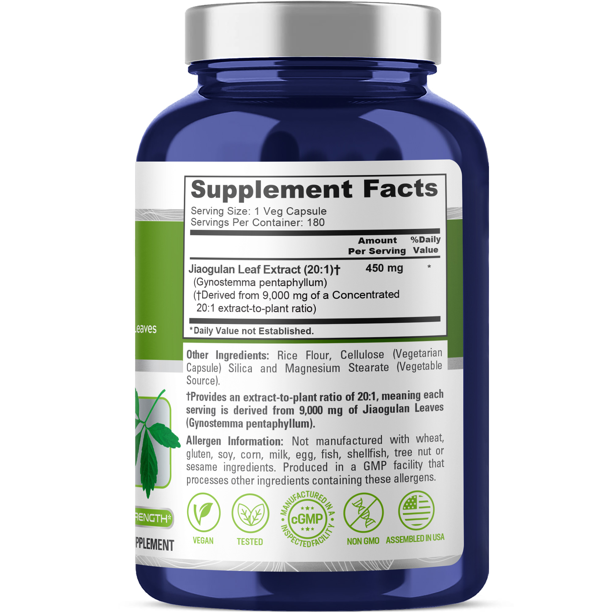 • Jiaogulan 20:1 Extract, 450 mg Equivalent to 9,000mg 180 Veggie Capsules.