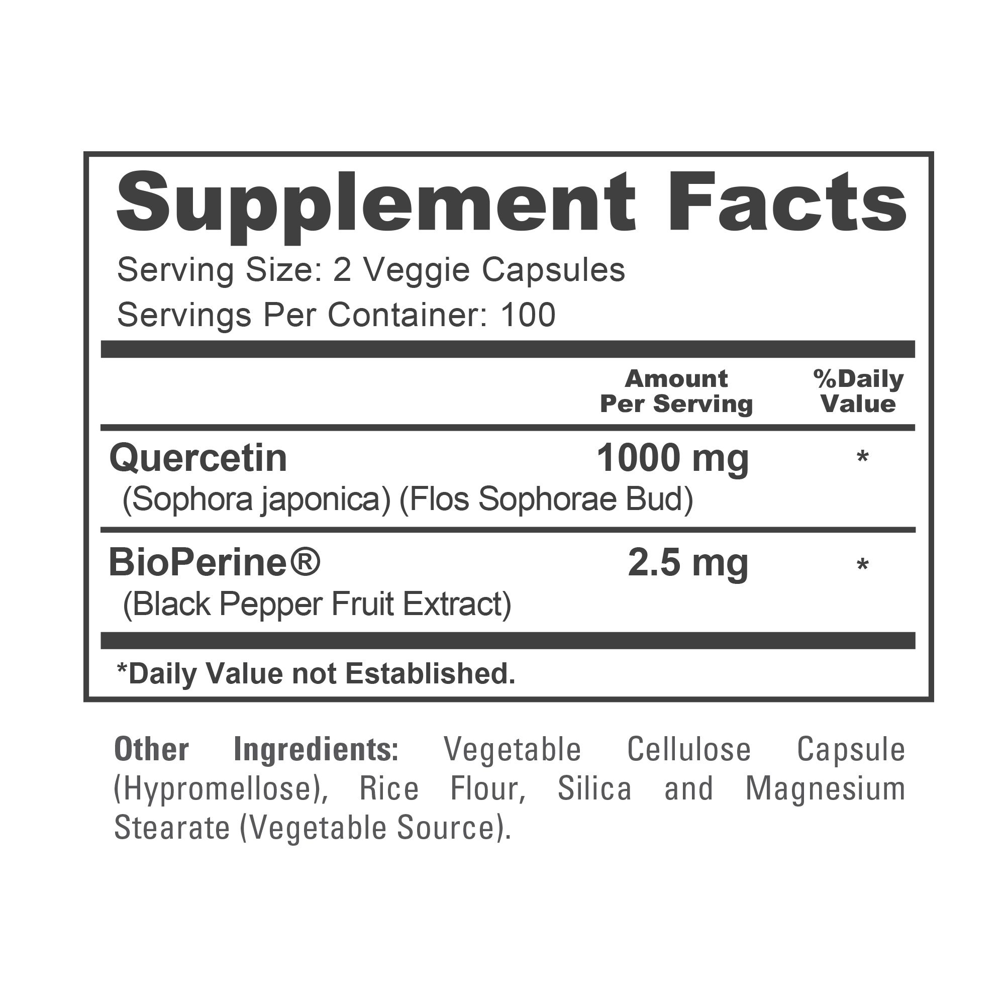 • Each serving delivers 1,000mg of Quercetin. Serving size is 2 veg capsules (500 mg per capsule).