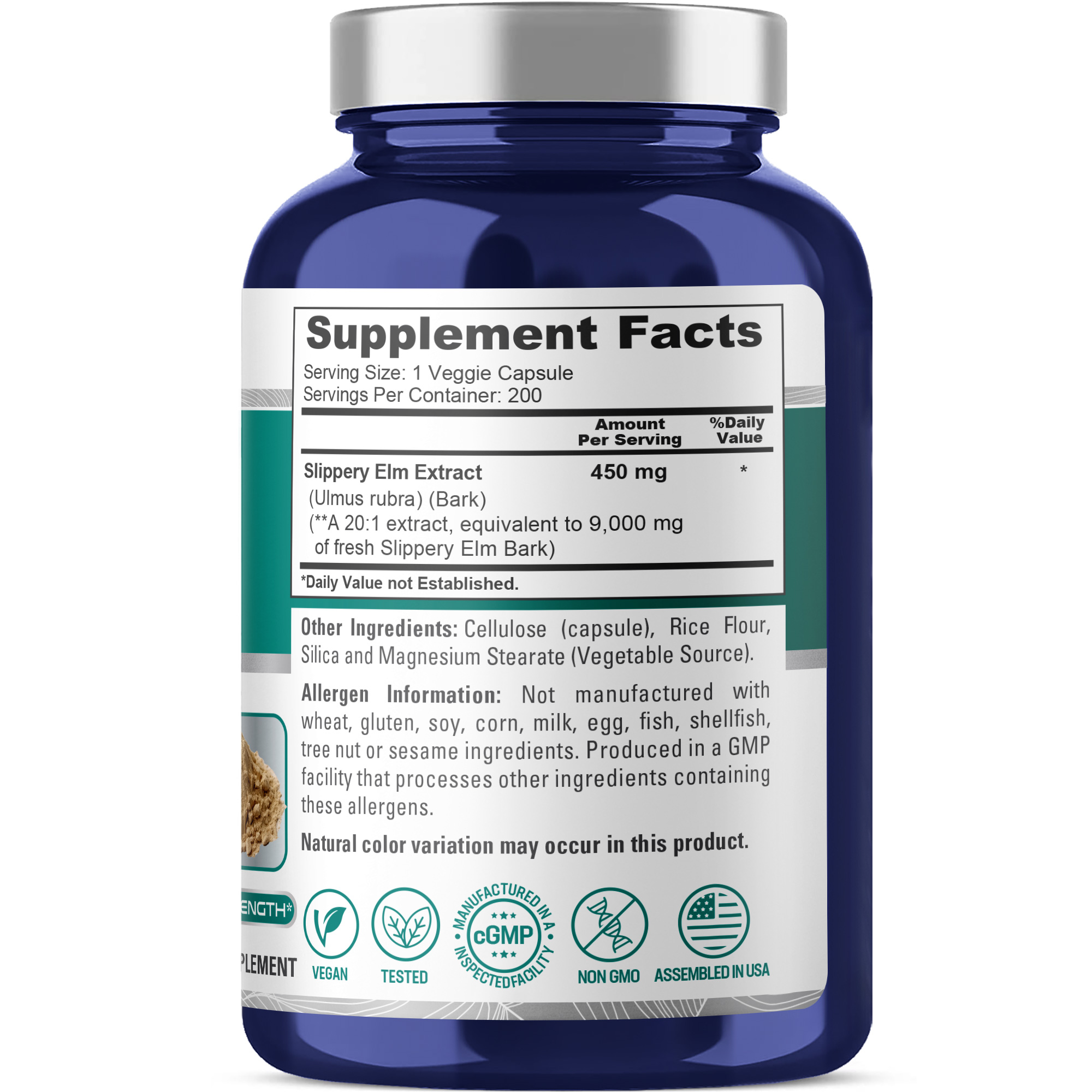 - Extra Strength: each serving delivers the equivalence of 9,000 mg of Slippery Elm Bark powder. Serving size is 1 veggie capsule. Extract at 20:1 potency.