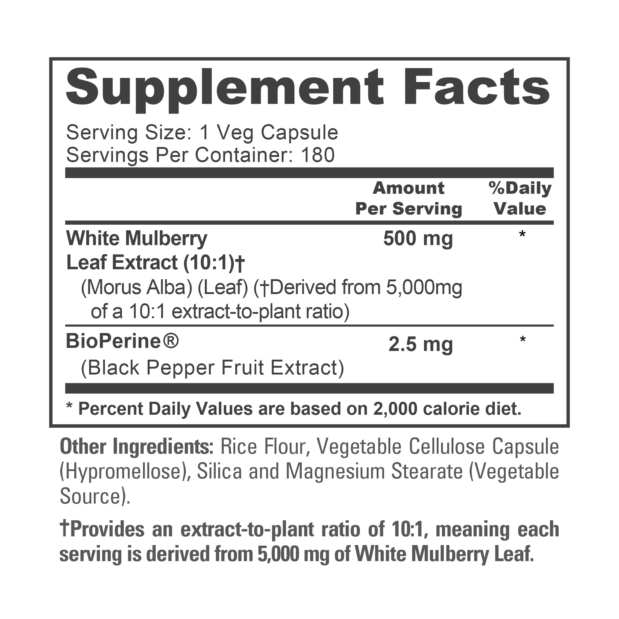 • With Extract at 10:1 potency, one capsule provides the equivalence of 5,000mg of White Mulberry Leaf.